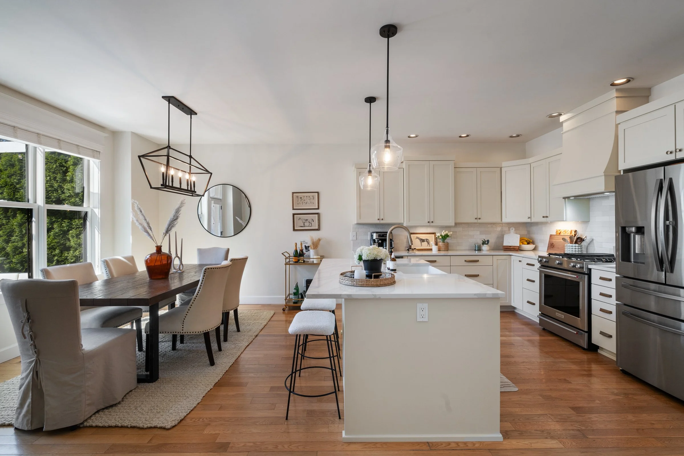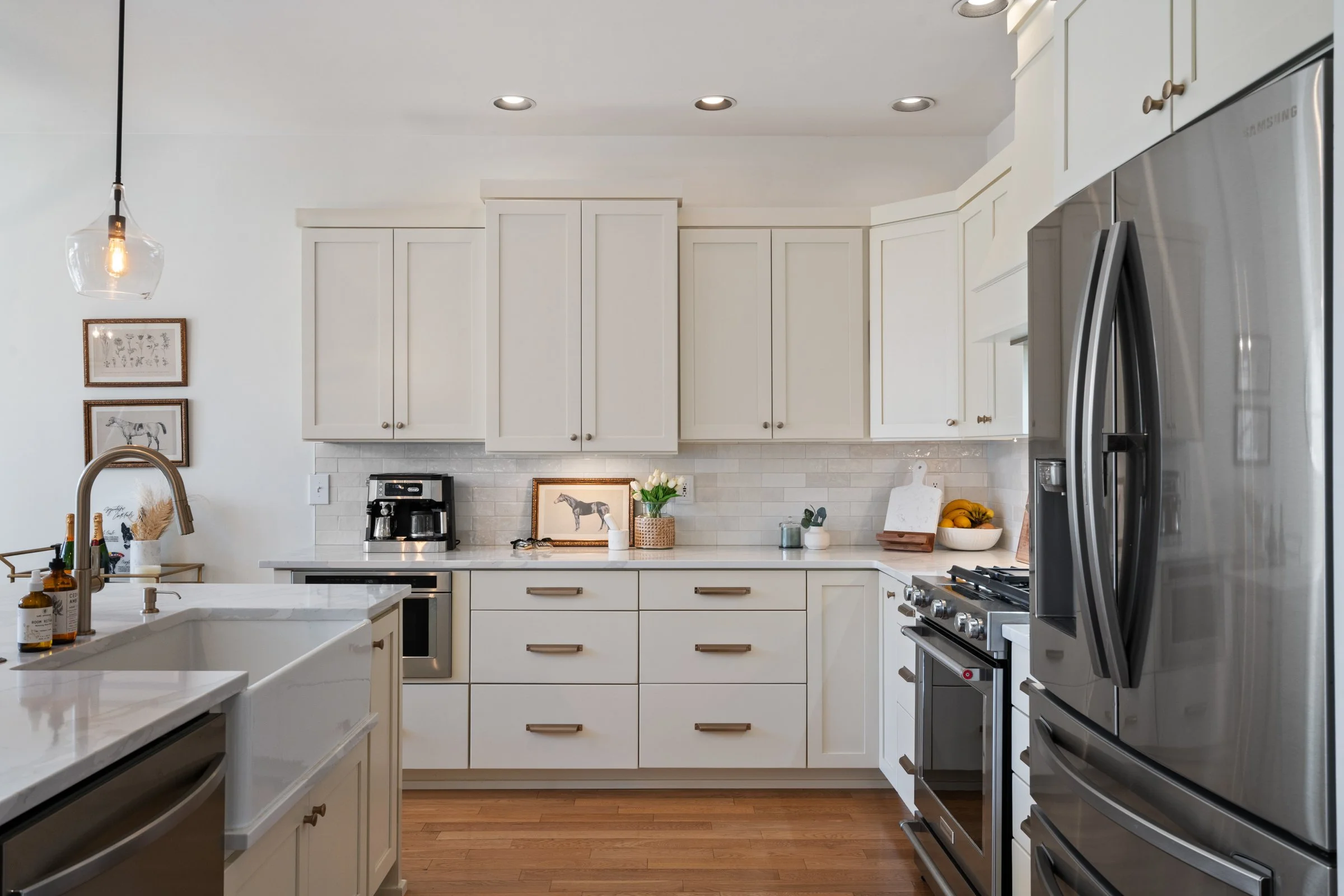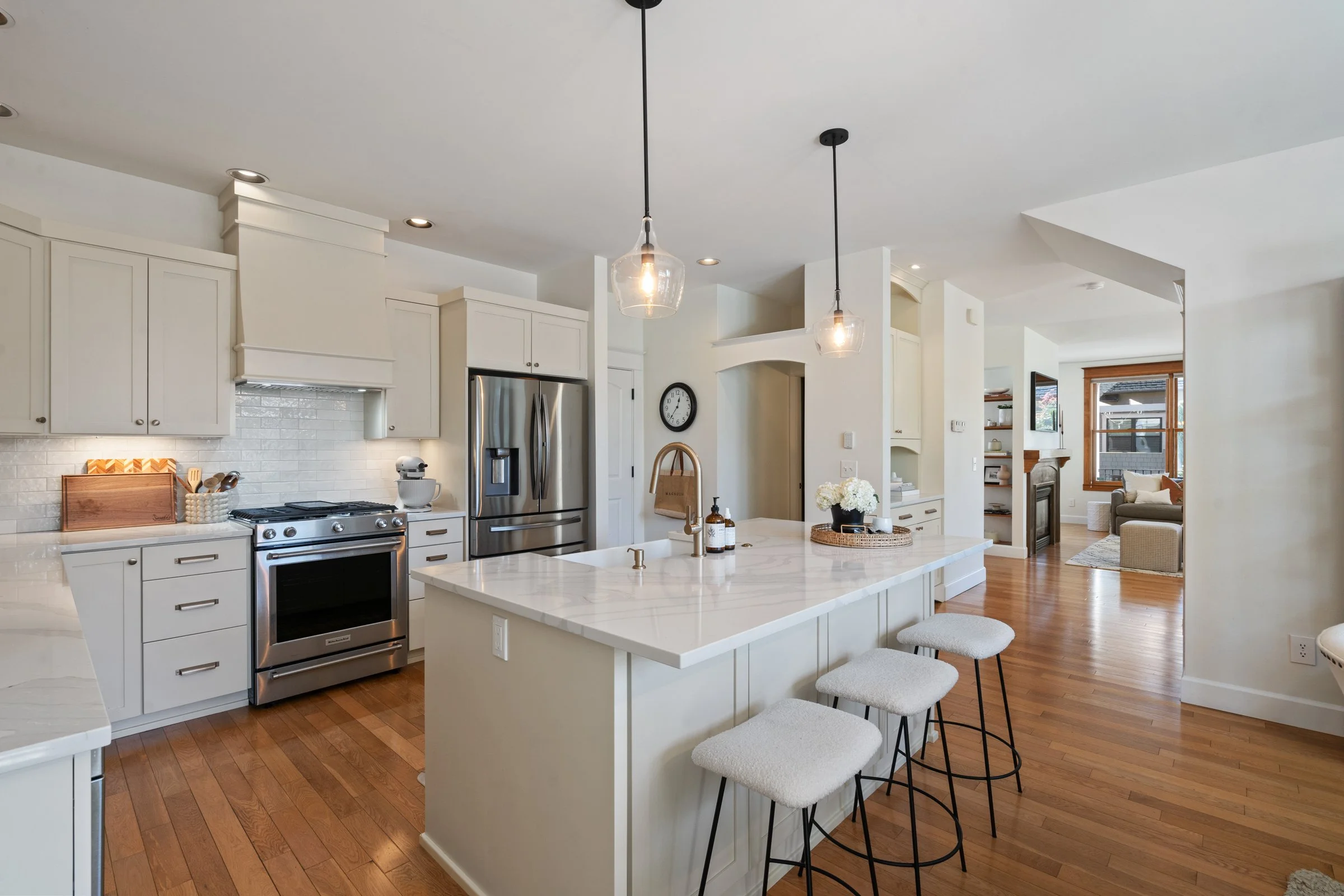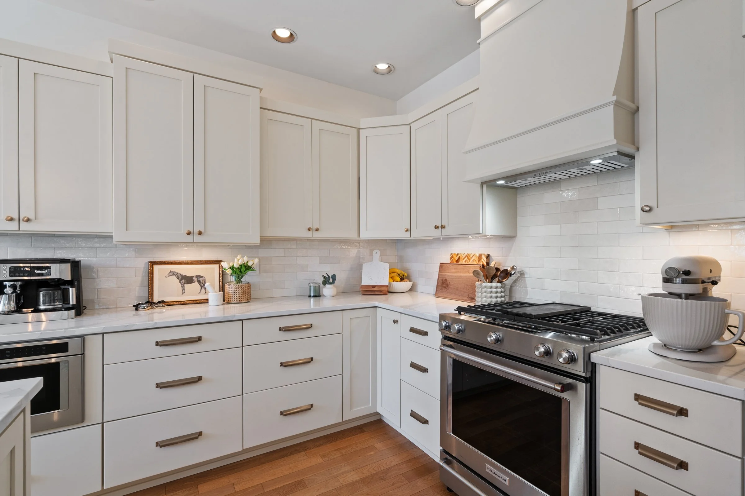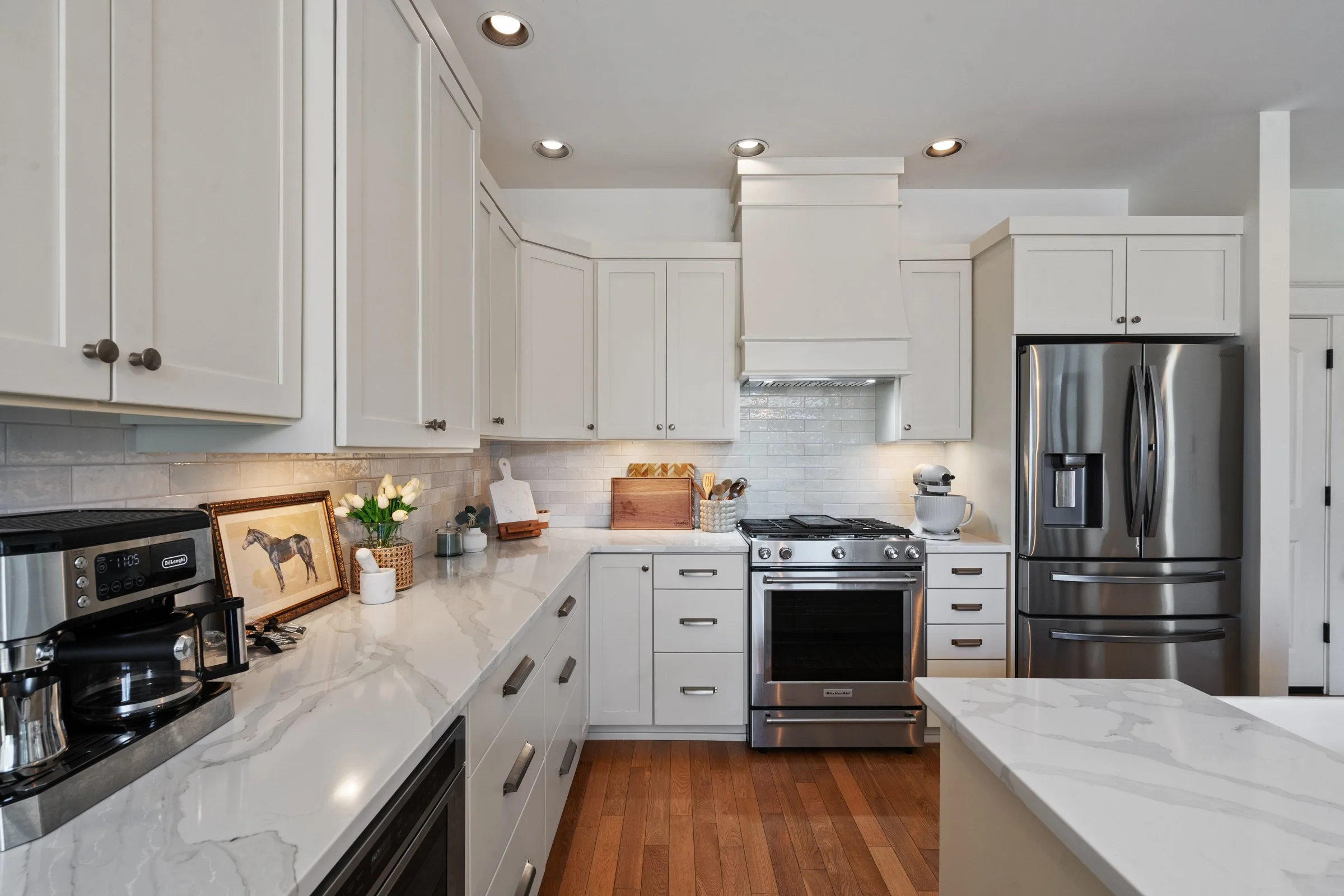 The freshly updated kitchen stands as the heart of the home, upgraded with sleek quartz countertops, stylish cabinets, and high-end Kitchen-Aid appliances.. Every bathroom mirrors this home’s modern feel, with recently updated cabinetry and finishes.