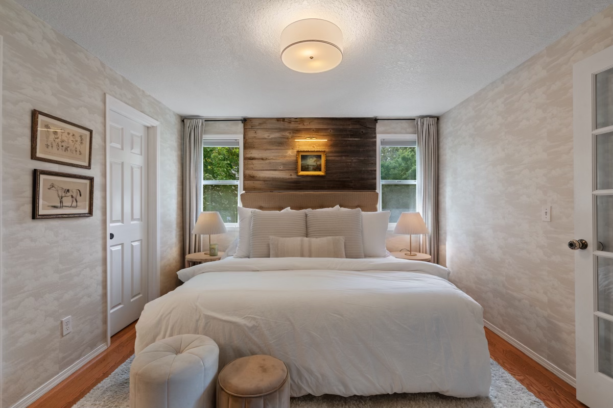 - Bathroom: Chic wall paint, textured tiles, and floors that make a statement